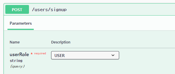 하지만 이번엔 RequestParam으로 Enum클래스를 바로 받아서 둘중에 하나만 고를수 있도록 해주고 거기서 고른 Role을 회원가입시에 추가해주는 형식으로 바꿔봤다.